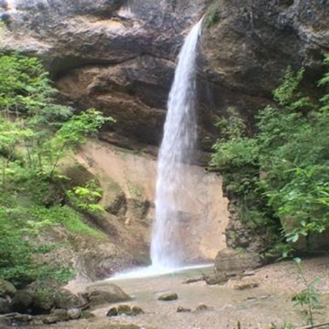 Wasserfall, mit Waldlehrpfad. Plakate von Kindern gestaltet