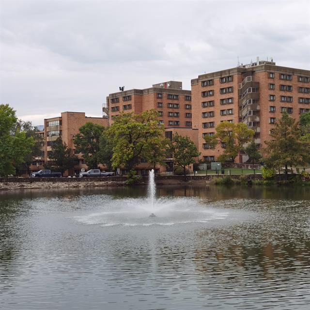 38 sA central campus landmark with a fountain and a student gathering area.
